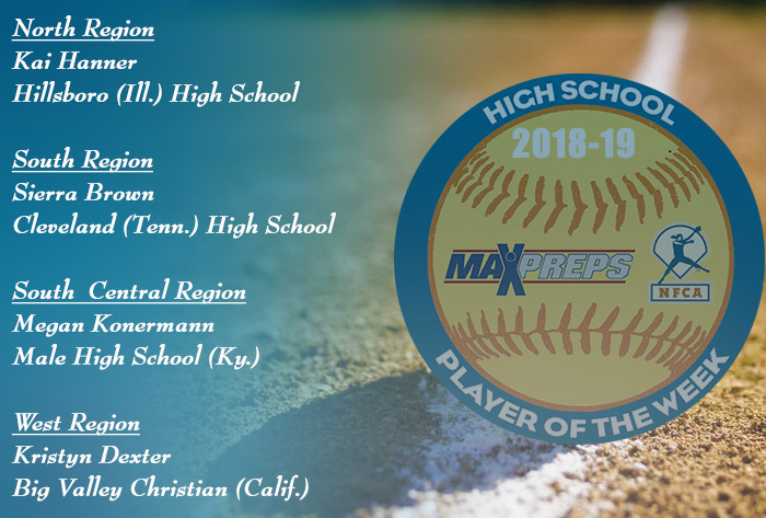 LOUISVILLE, Ky. –Hillsboro’s (Ill.) Kai Hanner, Cleveland’s (Tenn.) Sierra Brown, Male’s (Louisville, Ky.) Megan Konermann and Big Valley Christian’s (Modesto, Calif.) Kristyn Dexter were selected MaxPreps / NFCA National High School Players of the Week for their outstanding play during the week of March 18-24.