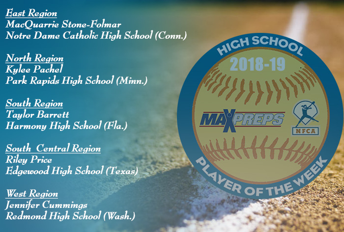LOUISVILLE, Ky. –MacQuarrie Stone-Folmar of Notre Dame Catholic (Fairfield, Conn.), Kylee Pachel of Park Rapids (Minn.), Taylor Barrett of Harmony (Fla.), Riley Price of Edgewood (Texas) and Jennifer Cummings of Redmond (Wash.) were selected MaxPreps / NFCA National High School Players of the Week for their outstanding play during the week of April 22-28.