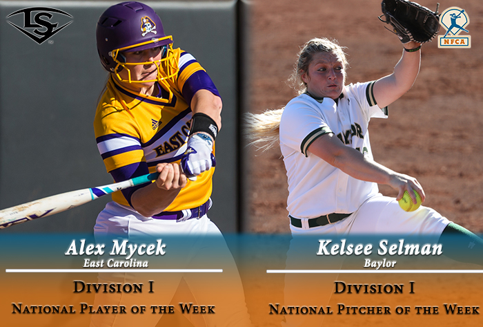 LOUISVILLE, Ky. – Behind an offensive explosion and a gritty pitching performance against national-ranked competition, East Carolina’s Alex Mycek and Baylor’s Kelsee Selman earned Louisville/Slugger NFCA Division I National Player and Pitcher of the Week, respectively, for games played Feb. 27-March, announced the Association on Tuesday afternoon.