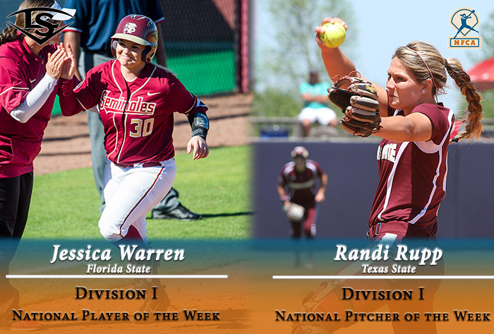 LOUISVILLE, Ky. – Florida State’s Jessica Warren and Texas State’s Randi Rupp were named Louisville Slugger NFCA Division I National Player and Pitcher of the Week, respectively, for games played April 3-9, announced the Association on Tuesday afternoon.