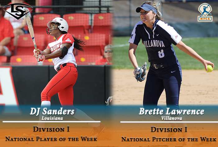 LOUISVILLE, Ky. – Louisiana shortstop DJ Sanders and Villanova southpaw Brette Lawrence named Louisville Slugger NFCA Division I National Player and of the Week, respectively, for games played April 17-23, announced the Association on Tuesday afternoon.