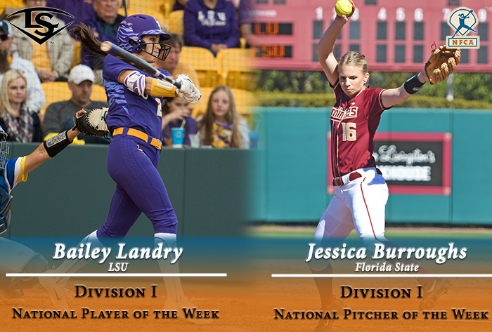 LOUISVILLE, Ky. – LSU’s Bailey Landry and Florida State’s Jessica Burroughs were named the Louisville/Slugger NFCA Division I National Player and Pitcher of the Week, respectively, for games played Feb. 13-19, announced the Association on Tuesday afternoon.