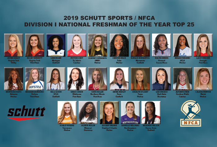 LOUISVILLE, Ky. –Twenty-five student-athletes are in the running for the 2019 Schutt Sports / NFCA Division I National Freshman of the Year award, announced the Association on Thursday afternoon. The winner will be presented prior to the start of the 2019 NCAA Women’s College World Series in Oklahoma City.