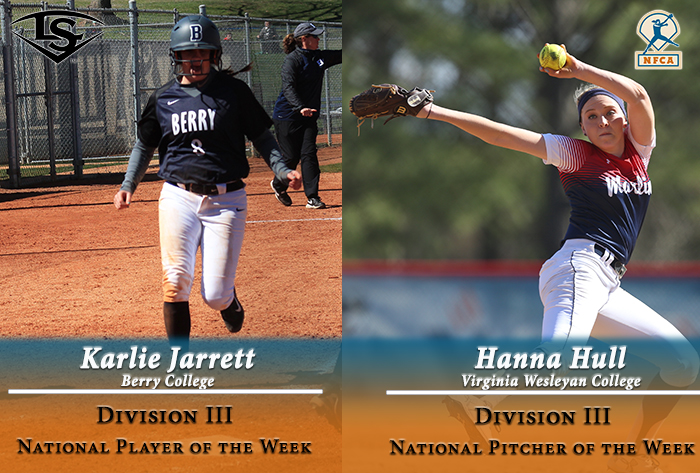 LOUISVILLE, Ky. — Virginia Wesleyan’s Hanna Hull repeated as Louisville Slugger/NFCA Division III National Pitcher of the Week and Berry’s Karlie Jarrett captured this week’s National Player of the Week honor.
