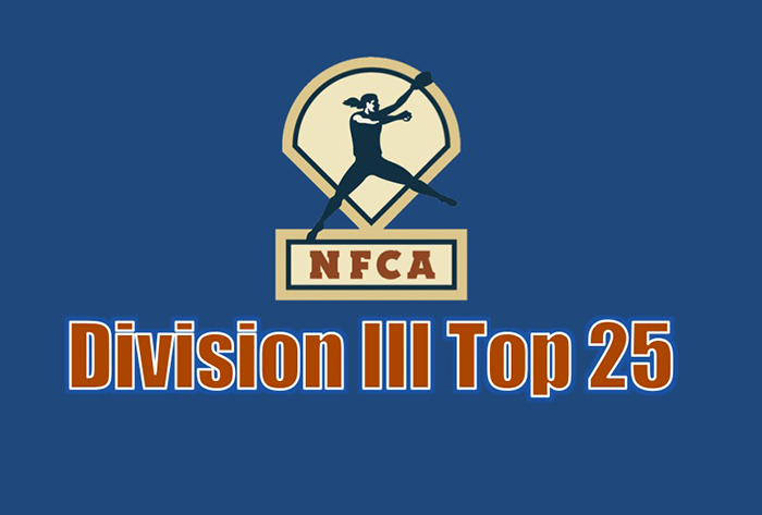 The NFCA Division III Top 25 Poll is selected by Division III head coaches representing the eight NCAA regions. Records through Sunday’s games are listed, with first-place votes in parentheses.